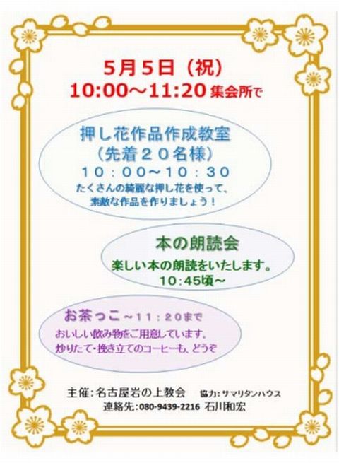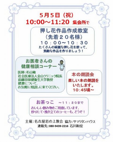 ・これは、名古屋岩の上教会の 2015 年 5 月連休ディアコニアとして行われたもので、サマリタンハウス(石川和宏・千鶴子)は企画段階から参画しお手伝いをした。