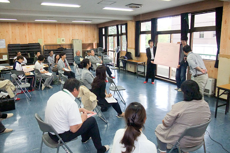 ミーティングの形式は二部構成になっており第一部は全体会、第二部で分科会になっており、毎回それぞれにテーマが設定されています。 第一部での話題提供は「仮設住宅個別訪問から見える今後の課題」と題し若林区保健センターの方が、仮設住宅の住人の健康面のお話をして下さいました。課題として生活環境の変化により活動量が低下し、体重増や体力の低下などの様子が見られる。そのため集会所での健康相談や体の不自由なかたの個別訪問をしていることなどを詳しく述べられました。
