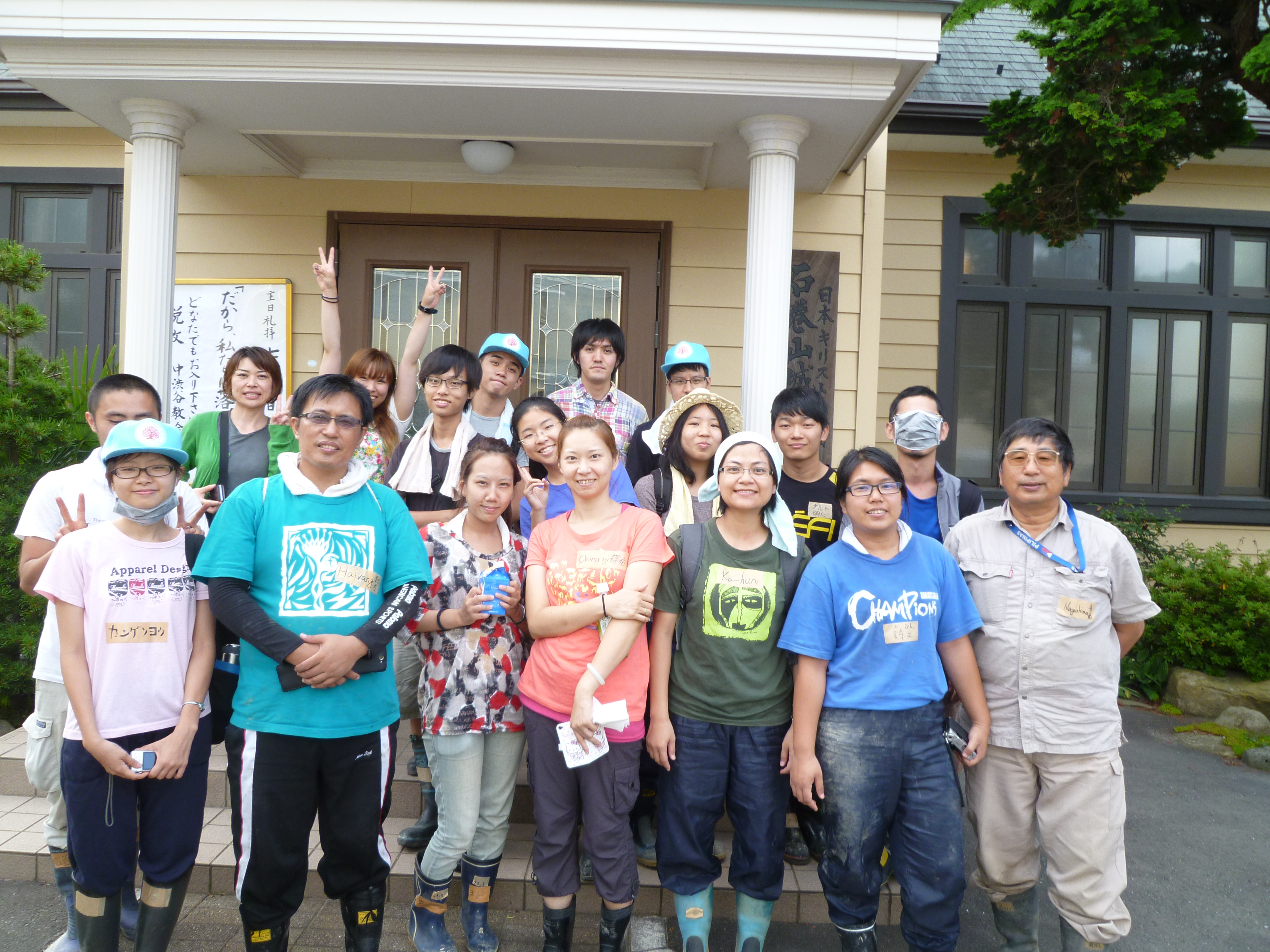 7月から9月にかけては日本各地からの青年達、年配の方達の他に、アメリカ・台湾の教会の方達がグループでボランティアとして参加して下さりました。エマオ石巻は被災地・築山の中にセンターとしての宿泊場所を持っています。ここに集う日本人青年参加者の大多数はノンクリスチャンでした。この人々にとって、石巻エマオは、被災地の人々と寄り添う働きとして活動しているキリスト者の働きに出会う(キリストの宣証)大切な場となったように思います。
