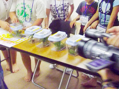 サプライズでTBSのロケ班がきました。先日のロケが雨で予定していたカブトムシが取れなかったのでクワガタをプレゼントしてくださいました。みんな興味津々で大喜びでした。後半は小さい子がにぎやかになり、高学年の子が怒ってしまいました。